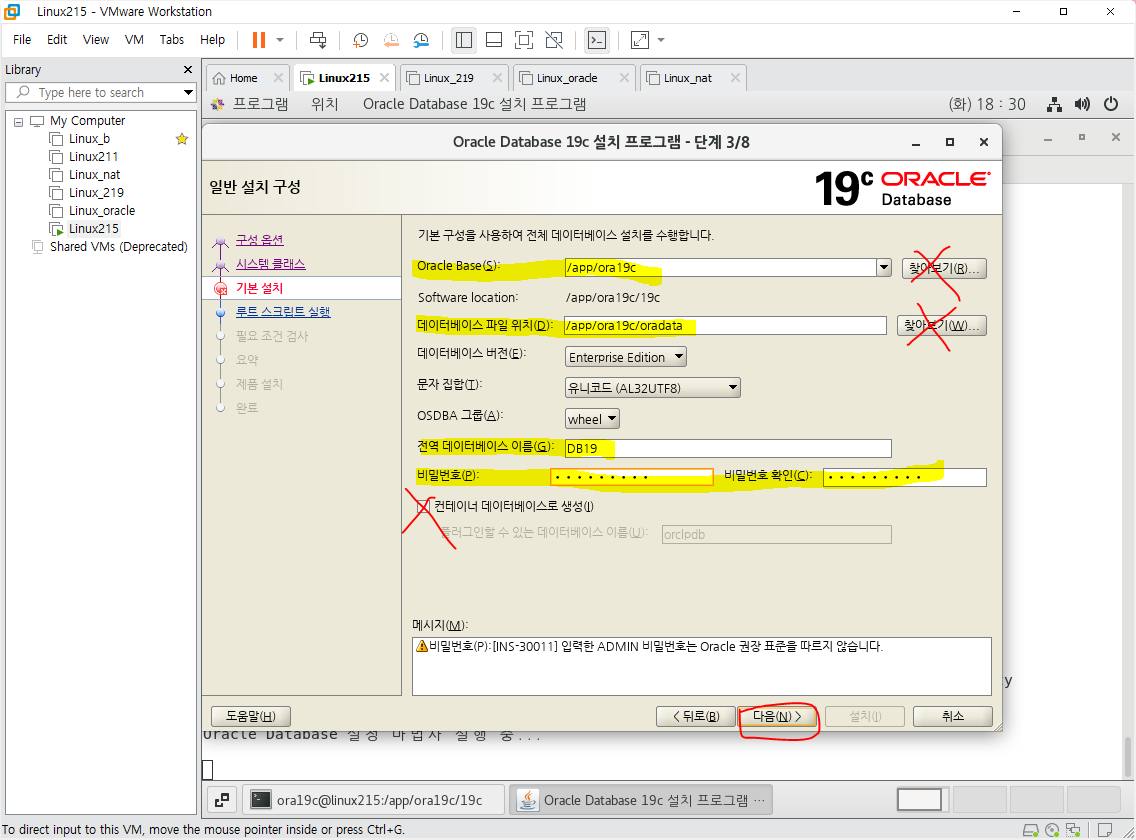 - 빨강표시부분을 체크 해주시고, 노랑마킹부분엔 루트비밀번호를 입력해주신 뒤에 다음을 눌러줍니다.