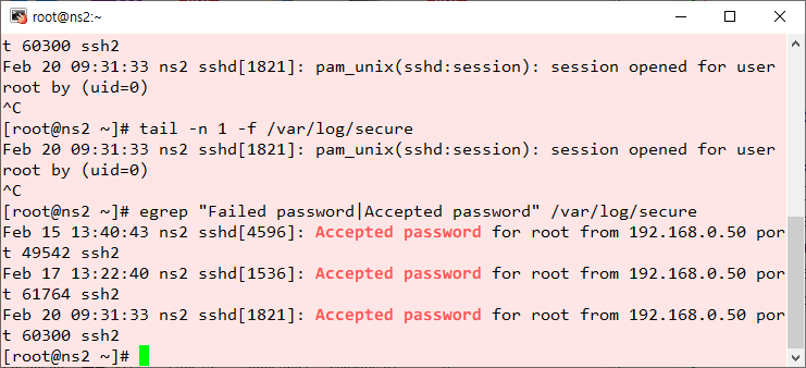 근데 이것도 너무많으면 그냥 failed password Accepted password 로그만 따로 목록화해서 로그인시도와 성공여부만 확인할 수도 잇음